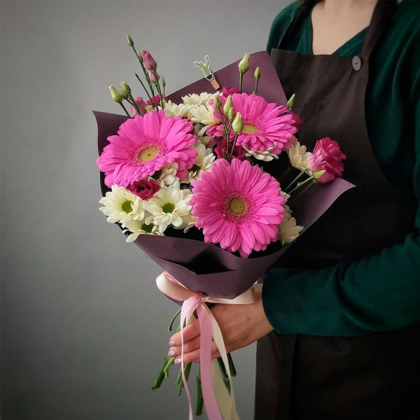 💐🌸Цей ніжний букет, що поєднує в собі гармонію гербер, хризантем та еустом, створює образ вишуканої краси. Три ніжні гербери додають букету грайливості та свіжості, дві кремові хризантеми додають нотку елегантності, а троє еустом створюють ніжну та чарівну атмосферу. Декоративний елемент надає букету завершеності та шарму. Комбінація рожево-кремових відтінків підкреслює ніжність та романтику цієї композиції. Цей букет - ідеальний вибір для вираження ніжності та захоплення, які довго запам'ятаються.